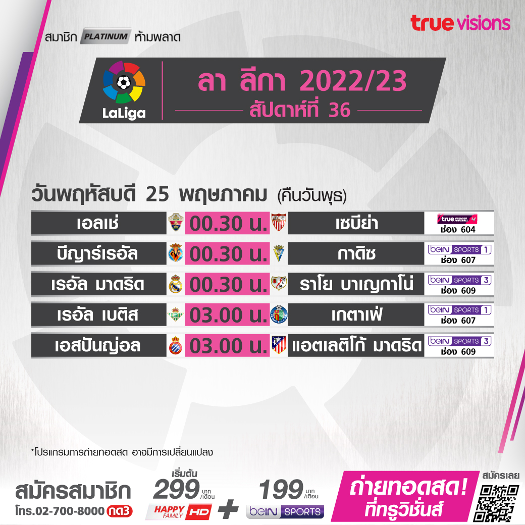 วันนี้มีอะไรดูที่ ทรูวิชั่นส์ ประจำวันพุธที่ 24 พฤษภาคม 66 ในส่วนของฟุตบอลยังมีศึกพรีเมียร์ลีก อังกฤษ และ ลา ลีกา สเปน ให้ได้ตามลุ้นตามเชียร์กันต่อ ส่วนกีฬาอื่นๆ ยังมีศึกเทนนิส เอทีพี ทัวร์ รายการ โกเน็ต เจนีวา โอเพ่น, ดับเบิ้ลยูทีเอ ทัวร์ รายการ ราบัต กรังด์ปรีซ์ และ กอล์ฟหญิง แอลพีจีเอ ทัวร์ รายการ แบงค์ ออฟ โฮป แอลพีจีเอ แมตช์เพลย์ งานนี้ ทรูวิชั่นส์ จัดเต็มให้ชมกันถึงบ้าน