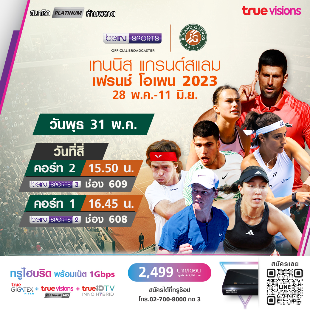 ศึกเทนนิส แกรนด์สแลมที่ 2 ของปี เฟร้นช์ โอเพ่น 2023 ที่สังเวียนอันศักดิ์สิทธิ์ โรลังด์ การ์รอส กรุงปารีส ฝรั่งเศส พร้อมระเบิดขึ้นแล้ว กับสุดยอดของการแข่งขันบนสนามเคลย์คอร์ต ชมสดจุใจถึง 15 วันเต็ม ร่วมลุ้นกันว่าใครจะเป็นราชินีและราชาคอร์ตดินปีนี้ ชมสด ทาง ทรูวิชั่นส์