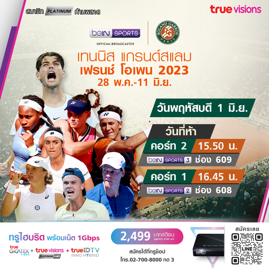 ศึกเทนนิส แกรนด์สแลมที่ 2 ของปี เฟร้นช์ โอเพ่น 2023 ที่สังเวียนอันศักดิ์สิทธิ์ โรลังด์ การ์รอส กรุงปารีส ฝรั่งเศส พร้อมระเบิดขึ้นแล้ว กับสุดยอดของการแข่งขันบนสนามเคลย์คอร์ต ชมสดจุใจถึง 15 วันเต็ม ร่วมลุ้นกันว่าใครจะเป็นราชินีและราชาคอร์ตดินปีนี้ ชมสด ทาง ทรูวิชั่นส์