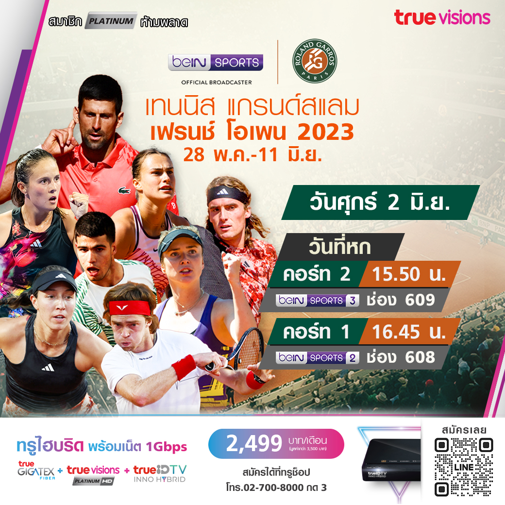 ศึกเทนนิส แกรนด์สแลมที่ 2 ของปี เฟร้นช์ โอเพ่น 2023 ที่สังเวียนอันศักดิ์สิทธิ์ โรลังด์ การ์รอส กรุงปารีส ฝรั่งเศส พร้อมระเบิดขึ้นแล้ว กับสุดยอดของการแข่งขันบนสนามเคลย์คอร์ต ชมสดจุใจถึง 15 วันเต็ม ร่วมลุ้นกันว่าใครจะเป็นราชินีและราชาคอร์ตดินปีนี้ ชมสด ทาง ทรูวิชั่นส์