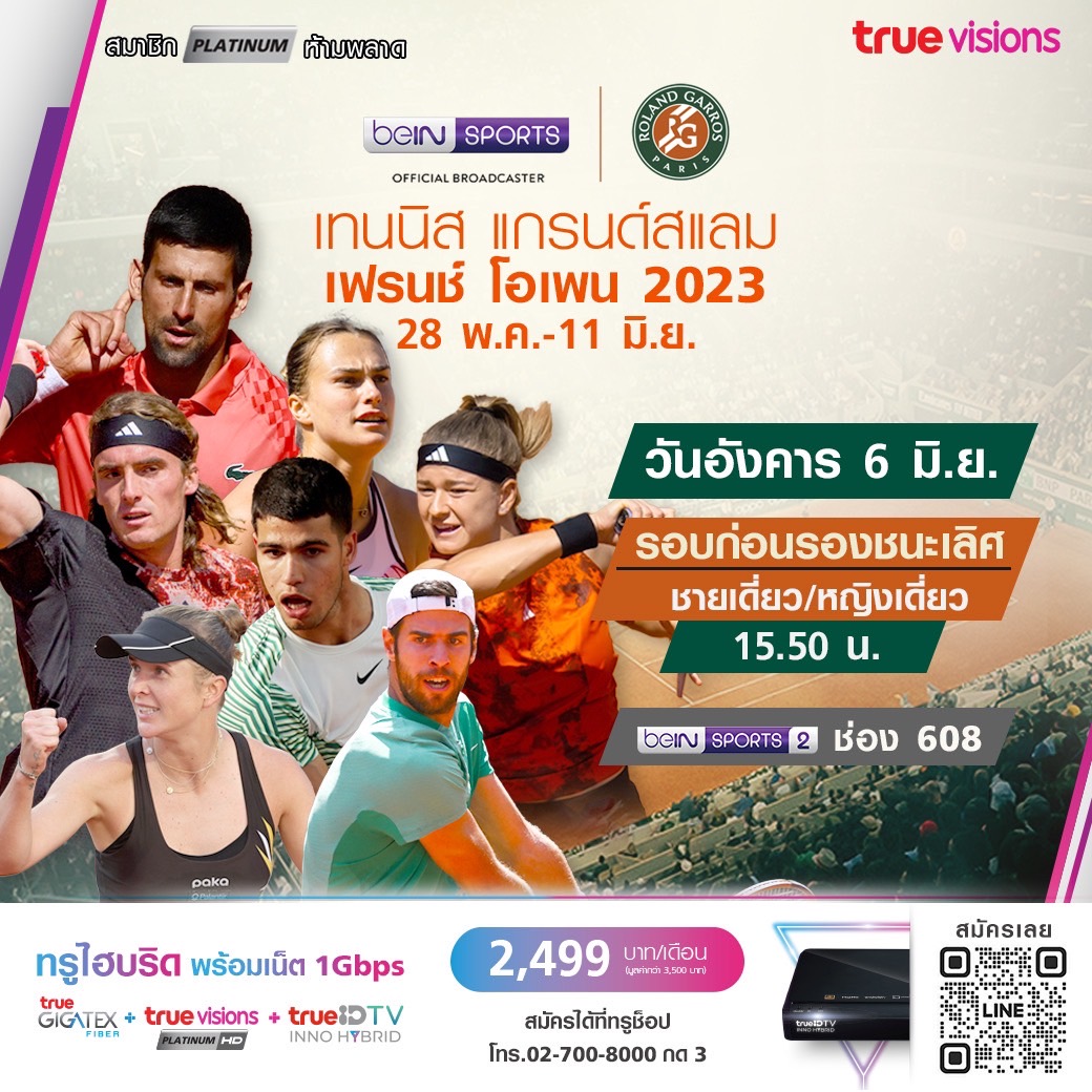 ศึกเทนนิส เฟร้นช์ โอเพ่น 2023 แกรนด์สแลมรายการที่ 2 ของปี ที่ โรลังด์ การ์รอส กรุงปารีส ประเทศฝรั่งเศส บนสนามเคลย์คอร์ต เดินทางมาถึงในรอบก่อนรองชนะเลิศ ใครจะก้าวไปเป็นแชมป์ ชมและเชียร์สดทาง ทรูวิชั่นส์
