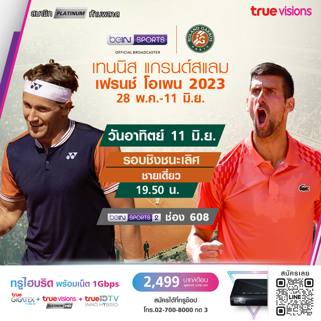ศึกเทนนิส แกรนด์สแลมที่ 2 ของปี เฟร้นช์ โอเพ่น 2023 ที่ โรลังด์ การ์รอส กรุงปารีส ประเทศฝรั่งเศส มาถึงในรอบชิงชนะเลิศชายเดี่ยว ร่วมลุ้นกันว่าใครจะเป็นราชาคอร์ตดินปีนี้ ชมสด ทาง ทรูวิชั่นส์