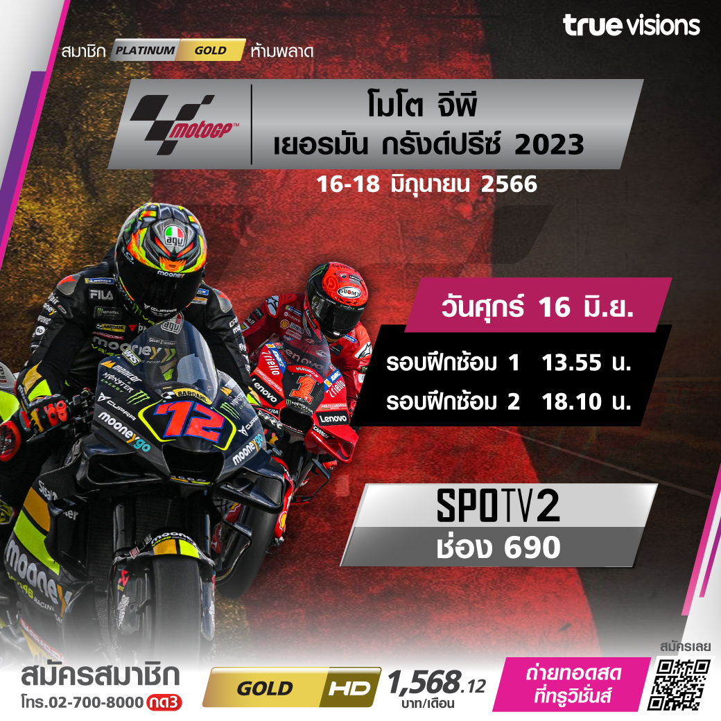 แฟนๆ โมโต จีพี เชียร์กันต่อกับมอเตอร์สปอร์ตระดับโลก โมโต จีพี เวิลด์ แชมเปี้ยนชิพ สนามที่ 7 ของฤดูกาล 2023 รายการ เยอรมัน กรังด์ปรีซ์ ที่สนาม ซาคเซนริง เซอร์กิต ประเทศเยอรมนี ลุ้นสนุกเร้าใจ ทั้ง โมโต 3, โมโต 2 และสุดๆ กับ โมโต จีพี ใครจะยืนแป้นสูงสุดบนโพเดี้ยม ชมสดกันสดๆ ครบทุกช่วง ชมสด ทาง ทรูวิชั่นส์