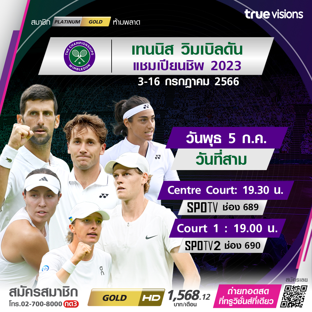วันนี้มีอะไรดูที่ ทรูวิชั่นส์ ประจำวันพุธที่ 5 กรกฎาคม 66 ไฮไลท์อยู่ที่ศึกเทนนิสแกรนด์สแลมรายการที่ 3 ของปี วิมเบิลดัน แชมเปี้ยนชิพ ครั้งที่ 136 งานนี้ ทรูวิชั่นส์ จัดเต็มให้ชมกันถึงบ้าน