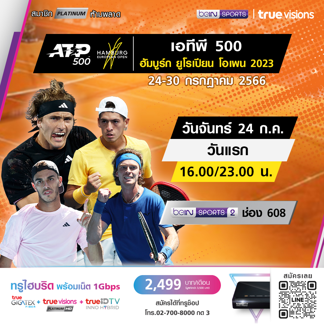 วันนี้มีอะไรดูที่ ทรูวิชั่นส์ ประจำวันจันทร์ที่ 24 กรกฎาคม 66 ยังมีศึกเทนนิส เอทีพี ทัวร์ รายการ ฮัมบูร์ก ยูโรเปี้ยน โอเพ่น ให้ได้ตามเชียร์กันต่อ งานนี้ ทรูวิชั่นส์ จัดเต็มให้ชมกันถึงบ้าน