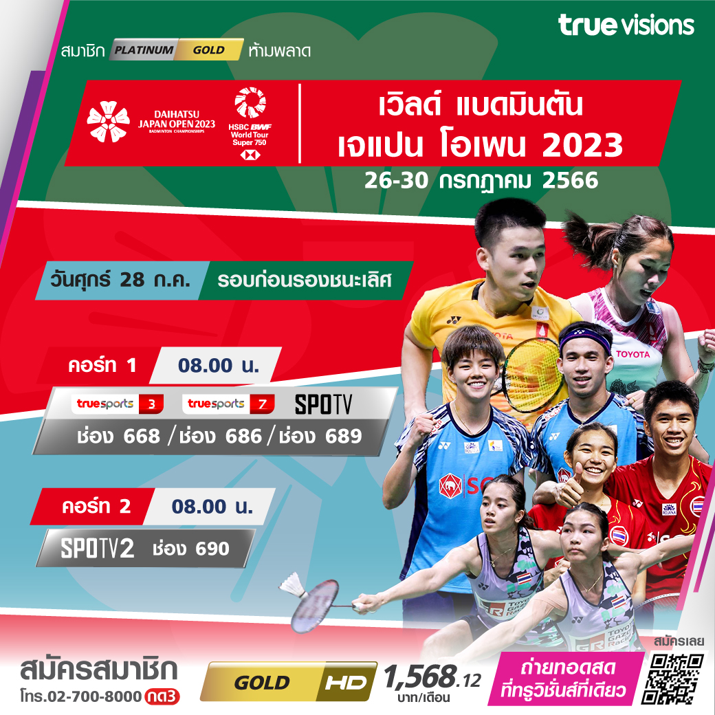 แบดมินตัน รายการ เจแปน โอเพ่น รายการสำคัญระดับ เวิลด์ ทัวร์ ซูเปอร์ 750 ในรอบก่อนรองชนะเลิศ ร่วมลุ้นและเชียร์นักแบดมินตันไทย สู้เพื่อคว้าชัยชนะกับคู่แข่งระดับโลก ชมสด เอ็กซ์คลูซีฟ ที่ ทรูวิชั่นส์