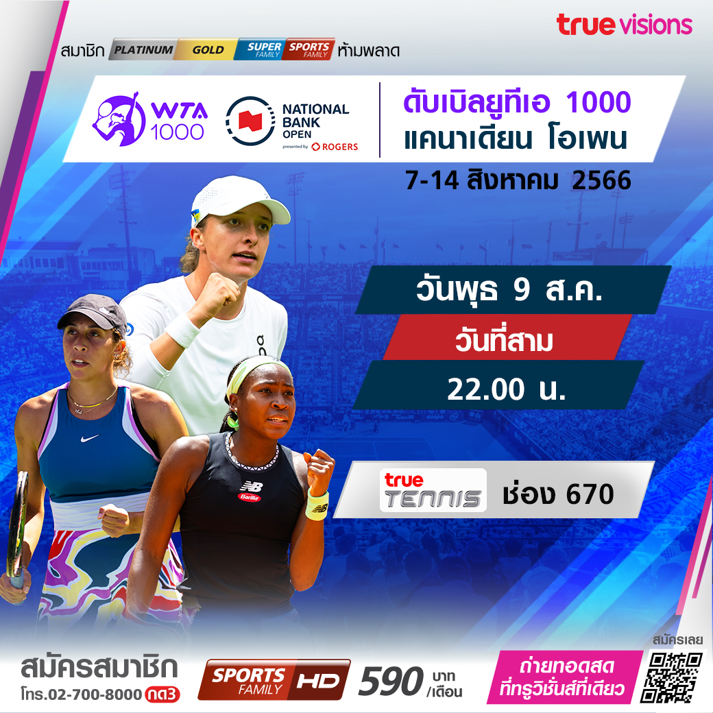 นับถอยหลังสู่แกรนด์สแลมสุดท้ายของปี ยูเอส โอเพ่น 2023 สัปดาห์นี้ แฟนๆ พลาดไม่ได้ กับรายการสำคัญของ ดับเบิ้ลยูทีเอ ทัวร์ 1000 ซีรี่ส์ เนชั่้นแนล แบงค์ โอเพ่น ที่ มอนทรีออล ประเทศแคนาดา มือดีๆ ของโลกไปลุ้นแชมป์กันอย่างคับคั่ง ชมสดเอ็กซ์คลูซีฟ ตั้งแต่รอบแรกถึงรอบชิงชนะเลิศ ที่ ทรูวิชั่นส์