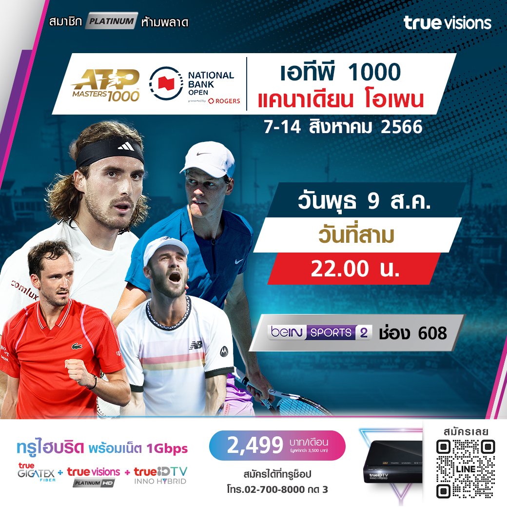 เทนนิส เอทีพี ทัวร์ สัปดาห์นี้ไปกันที่ โตรอนโต้ ประเทศแคนาดา กับศึกใหญ่ระดับ 1000 ซีรี่ส์ เนชั่นแนล แบงค์ โอเพ่น แฟนๆ ตัวจริงต้องติดตามกันให้ได้ กับผลงานของมือระดับท็อปของโลก ชมสดจุใจตั้งแต่รอบแรกถึงรอบชิงชนะเลิศ ที่ ทรูวิชั่นส์