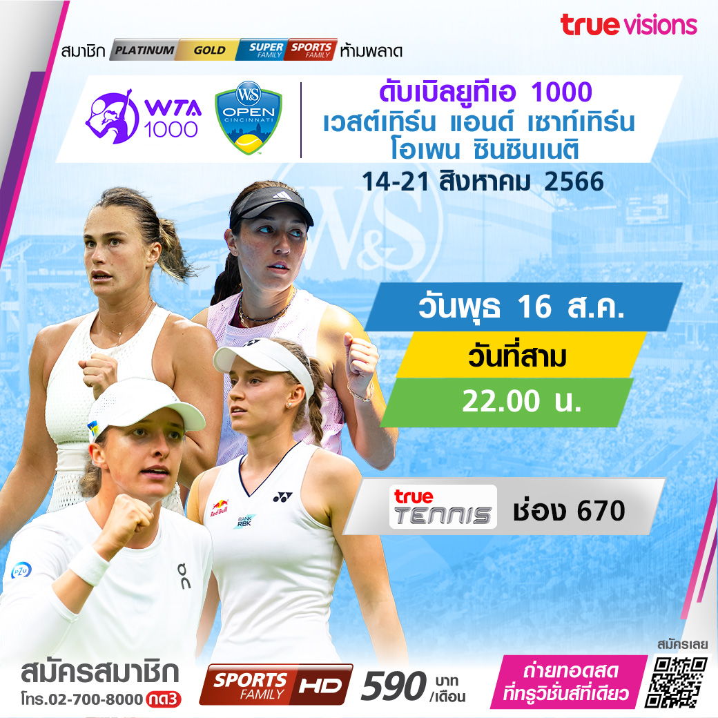 ความสนุกตื่นเต้นเพิ่มขึ้นเป็นทวีคูณ เมื่อ ยูเอส โอเพ่น ซีรีส์ เดินทางมาถึง ซินซินเนติ รัฐโอไฮโอ สหรัฐอเมริกา กับรายการใหญ่ระดับ ดับเบิลยูทีเอ 1000 เวสเทิร์น แอนด์ เซาเธิร์น โอเพ่น 2023 ชัยชนะทุกแมตช์มีความสำคัญ ทุกคะแนนสะสมมีผลต่ออันดับโลก ซูเปอร์สตาร์ของทัวร์ดวลกันคับคั่ง ใครจะเป็นผู้ครองตำแหน่งแชมป์ ชมสดเอ็กซ์คลูซีฟ ครบทุกรอบวันที่สาม เวลา 22.00 ทางช่อง True Tennis (670)