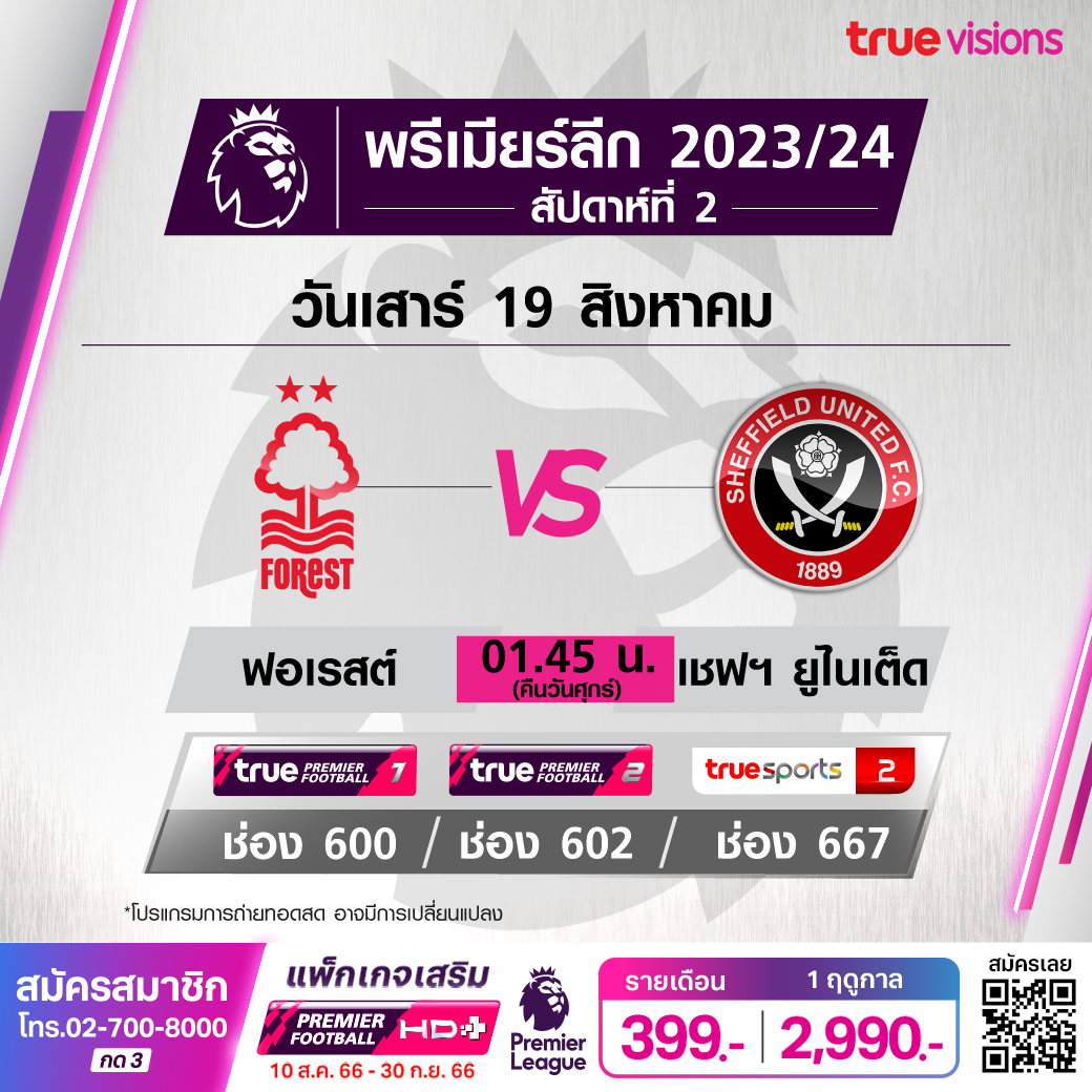 Nottingham Forest vs Sheffield United เวลา 01:45 - 03:45 ทางช่อง TPF 1(600) / TPF 2 (602)/TS 2 (667)