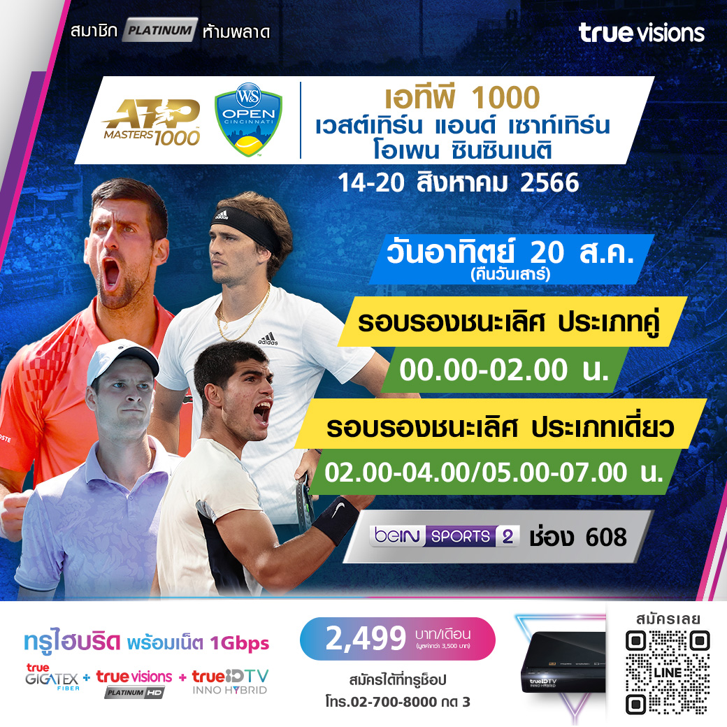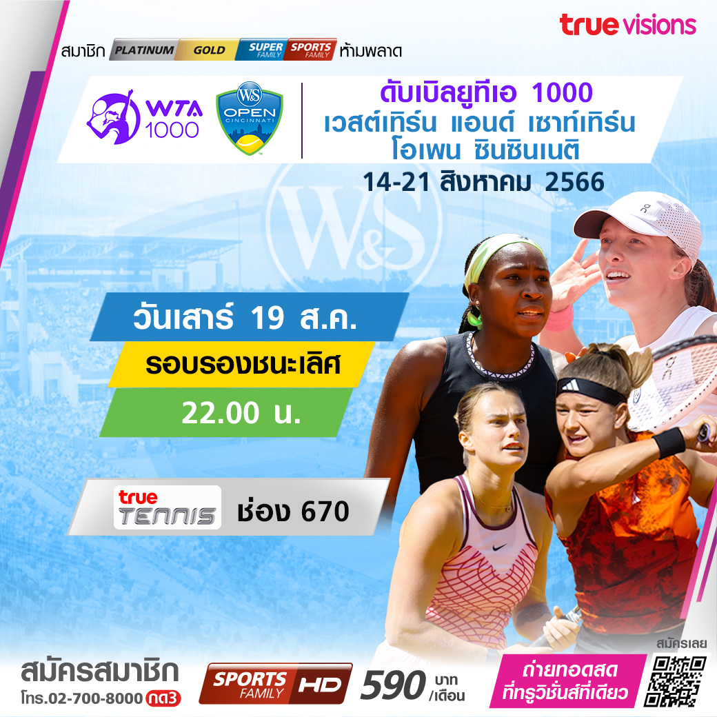 ดับเบิ้ลยูทีเอ 1000 รายการ เวสเทิร์น แอนด์ เซาเธิร์น โอเพ่น 2023 ที่ ซินซินเนติ รัฐโอไฮโอ สหรัฐอเมริกา มาถึงในรอบรองชนะเลิศ ชัยชนะทุกแมตช์มีความสำคัญ ทุกคะแนนสะสมมีผลต่ออันดับโลก ใครจะเป็นผู้ครองตำแหน่งแชมป์ ชมสดเอ็กซ์คลูซีฟ ครบทุกรอบรอบรองชนะเลิศ เวลา 22.00 ทางช่อง True Tennis (670)