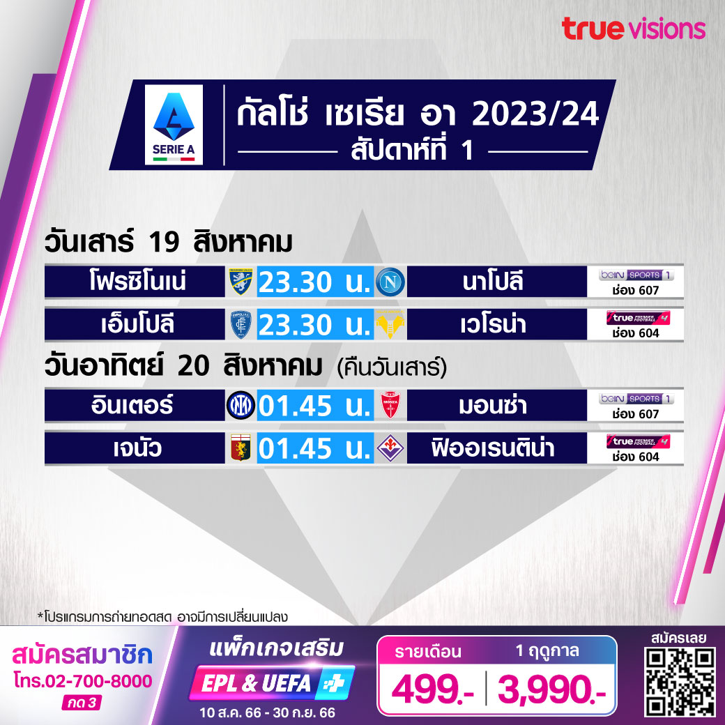Inter vs Monza เวลา 01.45-03.45 ทางช่อง beIN 1 (607)