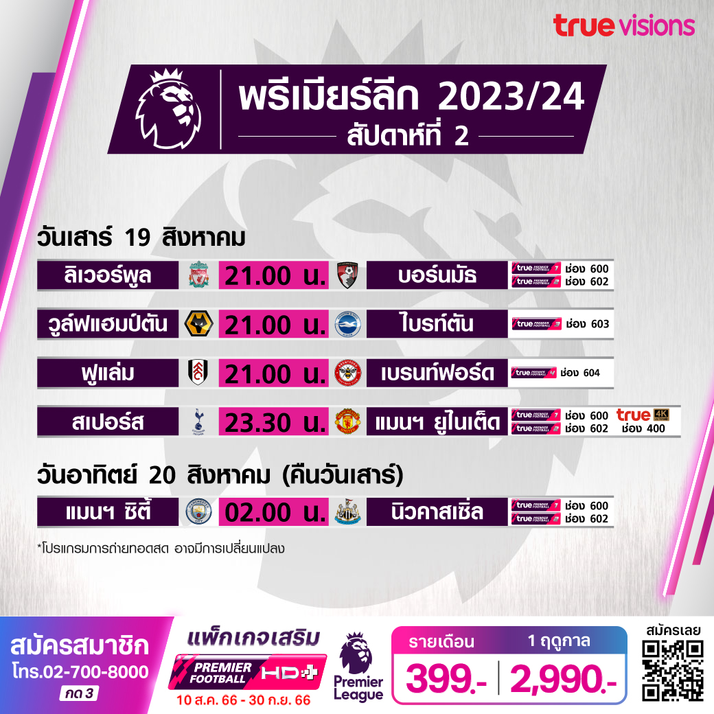 วันนี้มีอะไรดูที่ ทรูวิชั่นส์ ประจำวันเสาร์ที่ 19 สิงหาคม 66 ในส่วนของฟุตบอลนั้น จัดเต็มกับศึกพรีเมียร์ลีก อังกฤษ, กัลโช่ เซเรีย อา อิตาลี, บุนเดสลีกา เยอรมนี, ลา ลีกา สเปน, ลีก เอิง ฝรั่งเศส, ซาอุดิ โปร ลีก และ เอเอฟเอฟ ยู-23 แชมเปี้ยนชิพ ให้ได้ตามเชียร์กันอย่างต่อเนื่อง ส่วนกีฬาอื่นๆ ยังมีศึกโมโต จีพี รายการ ออสเตรียน กรังด์ปรีซ์, เทนนิส เอทีพี ทัวร์ และ ดับเบิ้ลยูทีเอ ทัวร์ 1000 ซีรี่ส์ รายการ เวสเทิร์น แอนด์ เซาเธิร์น โอเพ่น, กอล์ฟ พีจีเอ ทัวร์ รายการ บีเอ็มดับเบิ้ลยู แชมเปี้ยนชิพ, กอล์ฟ เอเชียนทัวร์ รายการ อินเตอร์เนชั่นแนล ซีรี่ส์ ที่อังกฤษ, ศึกไตรกีฬา พีทีโอ เอเชียน โอเพ่น, ศึกยูเอฟซี และศึก ไทยแลนด์ บาสเกตบอล ลีก งานนี้ ทรูวิชั่นส์ จัดเต็มให้ชมกันถึงบ้าน