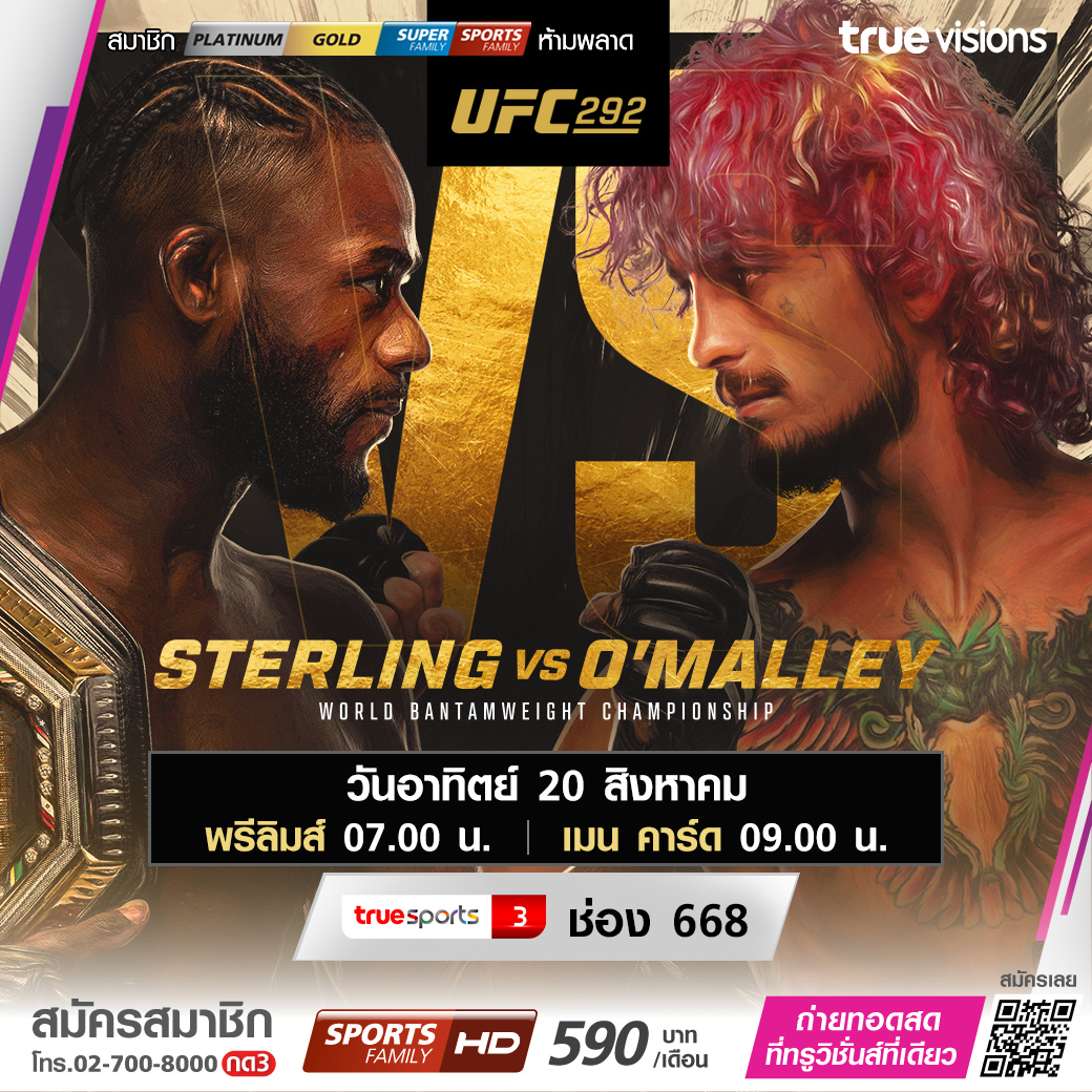 สิ้นสุดการรอคอยสำหรับแฟนๆ ศึกใหญ่ ศึกสำคัญในเดือนนี้ ระเบิดความมันส์กันด้วย ยูเอฟซี 292 ที่สังเวียน ทีดี การ์เด้น บอสตัน สหรัฐอเมริกา คู่เอก อันเจอเมน สเตอร์ลิ่ง ป้องกันแชมป์แบนตั้มเวตกับผู้ท้าชิงจอมเกรียน ฌอน โอมอลลี่ย์ และคู่เอกร่วม จาง เหว่ย ลี่ แชมป์รุ่นสตรอว์เวตจากจีน ป้องกันแชมป์กับผู้ท้าชิงจากบราซิล อแมนด้า เลโมช ชมสด เอ็กซคลูซีฟ ทั้งช่วงพรีลิมส์ และ เมน คาร์ด ชมสด ทาง ทรูวิชั่นส์ ที่เดียว