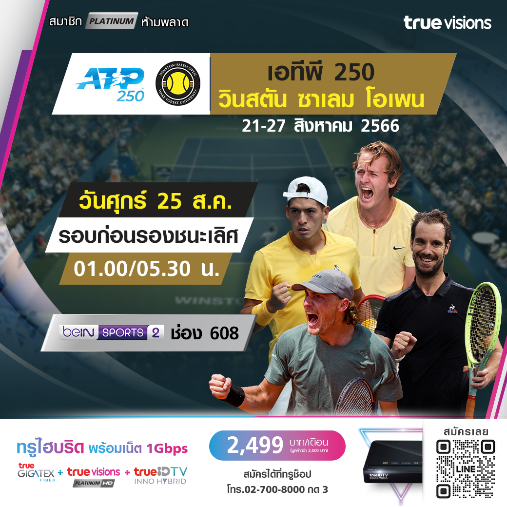 เทนนิส เอทีพี 250 รายการ วินสตัน ซาเล็ม โอเพ่น 2023 ที่นอร์ธ แคโรไลน่า ในรอบก่อนรองชนะเลิศ อุ่นเครื่องกันก่อนที่จะมุ่งหน้าสู่มหานครนิวยอร์ค เพื่อเข้าสู่ความยิ่งใหญ่ระดับแกรนด์สแลมที่ 4 ของปีอย่าง ยูเอส โอเพ่น สดทุกรอบสำคัญ ชมสด ทาง ทรูวิชั่นส์รอบก่อนรองชนะเลิศ เวลา 01.00 / 05.30 ทางช่อง beIN Sports 2 (608)