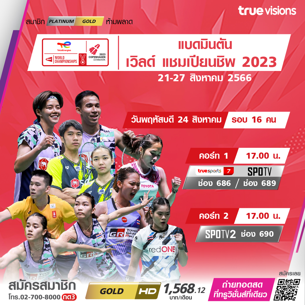 แบดมินตันรายการใหญ่ที่สุดของปี เวิลด์ แชมเปี้ยนชิพ 2023 ที่กรุงโคเปนเฮเกน ประเทศเดนมาร์ก ร่วมลุ้นและเชียร์สุดใจกับทีมแบดมินตันไทยสู้กับมือระดับโลก ชมสดเอ็กซ์คลูซีฟ ครบทุกรอบ ชมสด ทาง ทรูวิชั่นส์ ที่เดียวรอบ 16 คน คอร์ท 1 เวลา 17.00 ทางช่อง TS 7 (686) / SPOTV (689)