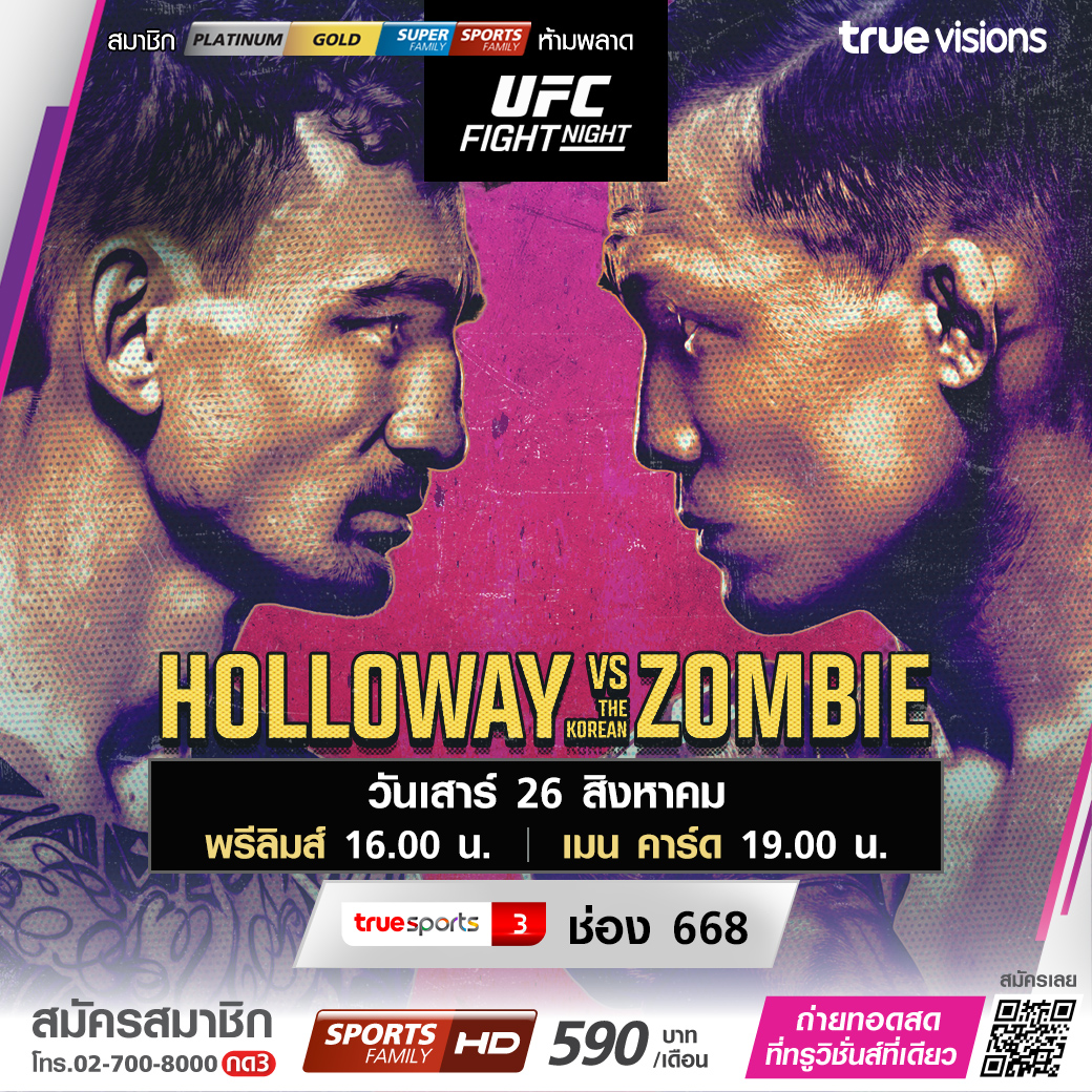 เอเชียสะเทือน เมื่อยอดนักสู้ระดับโลกจากยูเอฟซี ขนนักสู้พันธุ์ดุระดับซูเปอร์สตาร์ที่เป็นขวัญใจของแฟนๆ มาโชว์ฝีมือที่สิงคโปร์ กับ ยูเอฟซี ไฟต์ไนท์ คู่เอก แม็กซ์ ฮอลโลเวย์ อดีตแชมป์รุ่นเฟเธอร์เวตจากฮาวาย ปะทะ เดอะ โคเรียน ซอมบี้ จุง ซาน-ซุง นักสู้จอมเก๋าจากแดนกิมจิ สดเอ็กซ์คลูซีฟ จุใจ ทั้งช่วง พรีลิมส์ และ เมน คาร์ด ชมสด ทาง ทรูวิชั่นส์ ที่เดียว