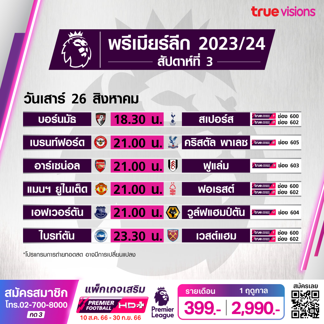 วันนี้มีอะไรดูที่ ทรูวิชั่นส์ ประจำวันเสาร์ที่ 26 สิงหาคม 66 ในส่วนของฟุตบอลนั้น ยังมีศึกพรีเมียร์ลีก อังกฤษ, กัลโช่ เซเรีย อา อิตาลี, บุนเดสลีกา เยอรมนี, ลา ลีกา สเปน, ลีก เอิง ฝรั่งเศส และ เอเอฟเอฟ ยู-23 แชมเปี้ยนชิพ ให้ได้ตามเชียร์กันอย่างต่อเนื่อง ส่วนกีฬาอื่นๆ ยังมีศึกฟอร์มูล่า วัน รายการ ดัตช์ กรังด์ปรีซ์, เทนนิส เอทีพี ทัวร์ รายการ วินสตัน ซาเล็ม โอเพ่น, ดับเบิ้ลยูทีเอ ทัวร์ รายการ เทนนิส อิน เดอะ แลนด์, กอล์ฟ พีจีเอ ทัวร์ รายการ ทัวร์ แชมเปี้ยนชิพ, เอเชียน ทัวร์ รายการ เซนต์ แอนดรูว์ส เบย์ แชมเปี้ยนชิพ, แอลพีจีเอ ทัวร์ รายการ แคนาเดียน แปซิฟิก วีเมนส์ โอเพ่น, แบดมินตัน บีดับเบิ้ลยูเอฟ รายการ เวิลด์ แชมเปี้ยนชิพ 2023, ยูเอฟซี ไฟต์ ไนท์, เวิลด์ สนุกเกอร์ รายการ ยูโรเปี้ยน มาสเตอร์ และศึกไทยแลนด์ บาสเกตบอล ลีก งานนี้ ทรูวิชั่นส์ จัดเต็มให้ชมกันถึงบ้าน