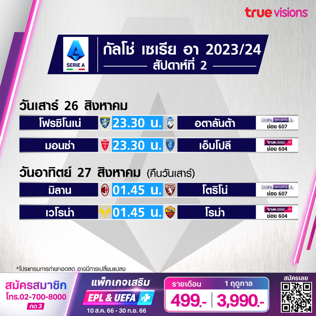 Verona vs Roma เวลา 01.45-03.45 ทางช่อง TPF 4 (604)