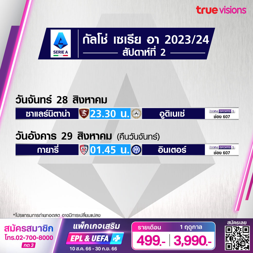 Cagliari vs Inter เวลา 01.45-03.45 ทางช่อง beIN 1 (607)