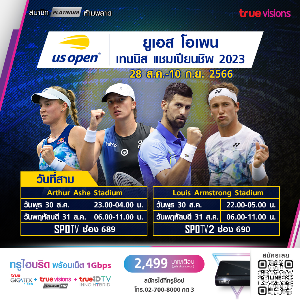 การรอคอยของแฟนๆ สิ้นสุดลงแล้ว เมื่อเทนนิสแกรนด์สแลมสุดยิ่งใหญ่ของปีเดินทางมาถึง กับรายการ ยูเอส โอเพ่น เทนนิส แชมเปี้ยนชิพ 2023 ที่มหานครนิวยอร์ค สหรัฐอเมริกา เวทีที่นักเทนนิสที่เก่งที่สุดของโลกมาประชันฝีมือกันแบบครบทั้งชายและหญิง ใครจะเป็นแชมป์ปิดท้ายปี ลุ้นและชมสดๆ แบบเอ็กซ์คลูซีฟ ทาง ทรูวิชั่นส์ ที่เดียว