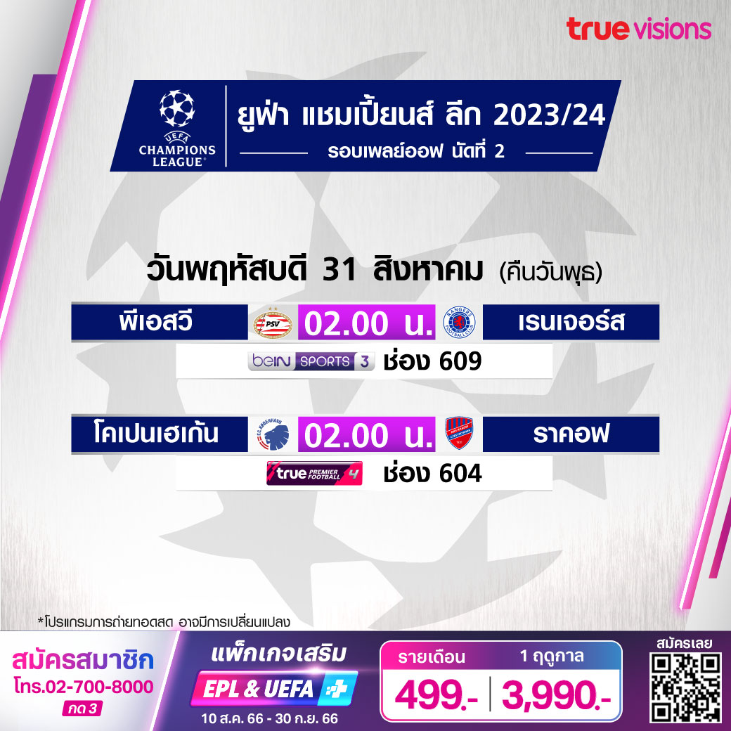 PSV vs Rangers เวลา 02.00-04.00 ทางช่แง beIN 3 (609)