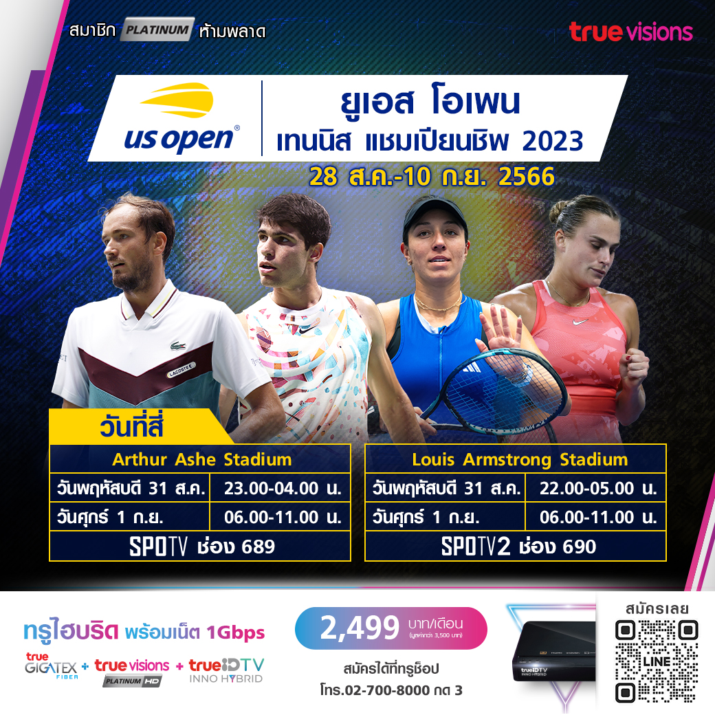 การรอคอยของแฟนๆ สิ้นสุดลงแล้ว เมื่อเทนนิสแกรนด์สแลมสุดยิ่งใหญ่ของปีเดินทางมาถึง กับรายการ ยูเอส โอเพ่น เทนนิส แชมเปี้ยนชิพ 2023 ที่มหานครนิวยอร์ค สหรัฐอเมริกา เวทีที่นักเทนนิสที่เก่งที่สุดของโลกมาประชันฝีมือกันแบบครบทั้งชายและหญิง ใครจะเป็นแชมป์ปิดท้ายปี ลุ้นและชมสดๆ แบบเอ็กซ์คลูซีฟ ทาง ทรูวิชั่นส์ ที่เดียว