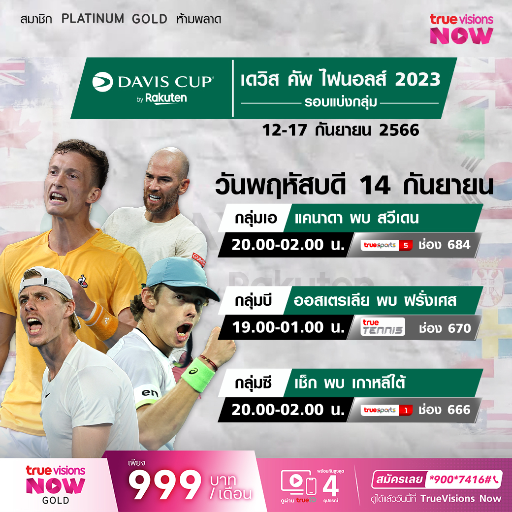 กลุ่ม บี ออสเตรเลีย พบ สหราชอาณาจักร เวลา 19.00 - 01.00 ทางช่อง True Tennis (670)