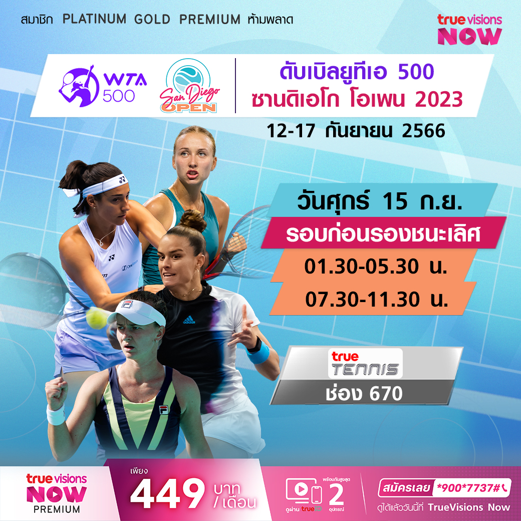 ศึกเทนนิสหญิง ดับเบิ้ลยูทีเอ ทัวร์ รายการระดับ 500 ซีรี่ส์ ซาน ดีเอโก้ โอเพ่น 2023 มือดี มือท็อปของโลก พร้อมจัดเต็มเพื่้อตำแหน่งแชมป์ปีนี้ มันส์แน่นอน สด เอ็กซ์คลูซีฟ ทาง ทรูวิชั่นส์ ที่เดียวรอบก่อนรองชนะเลิศ เวลา 01.30 - 05.30 / 07.30 - 11.30 ทางช่อง True Tennis (670)