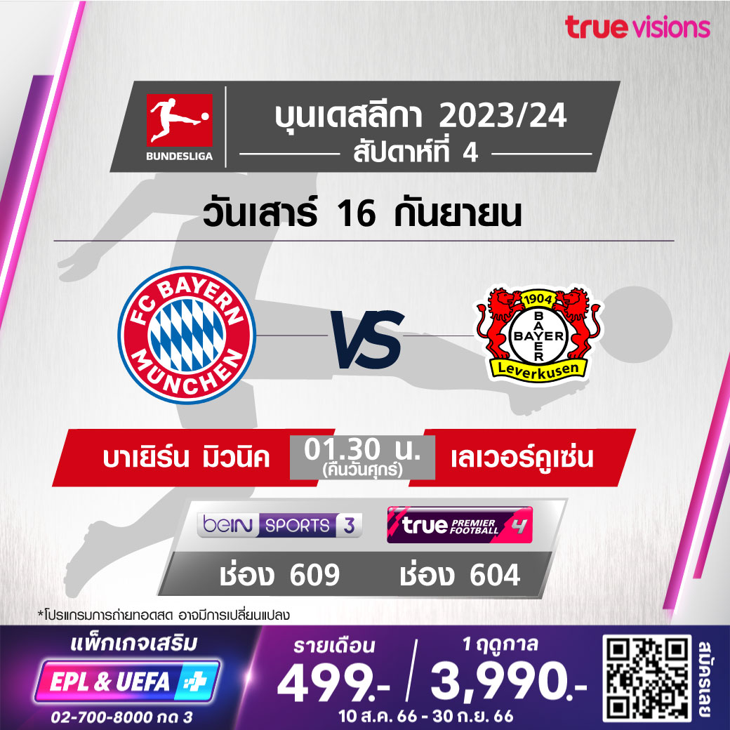 Bayern vs Leverkusen เวลา 01.30-03.30 ทางช่อง beIN 3 (609) / TPF 4 (604)