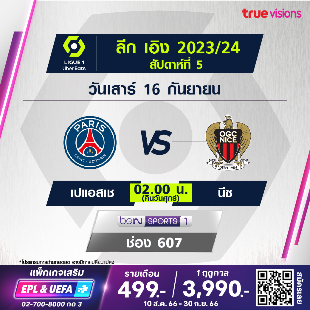 PSG vs Nice เวลา 02.00-04.00 ทางช่อง beIN 1 (607)