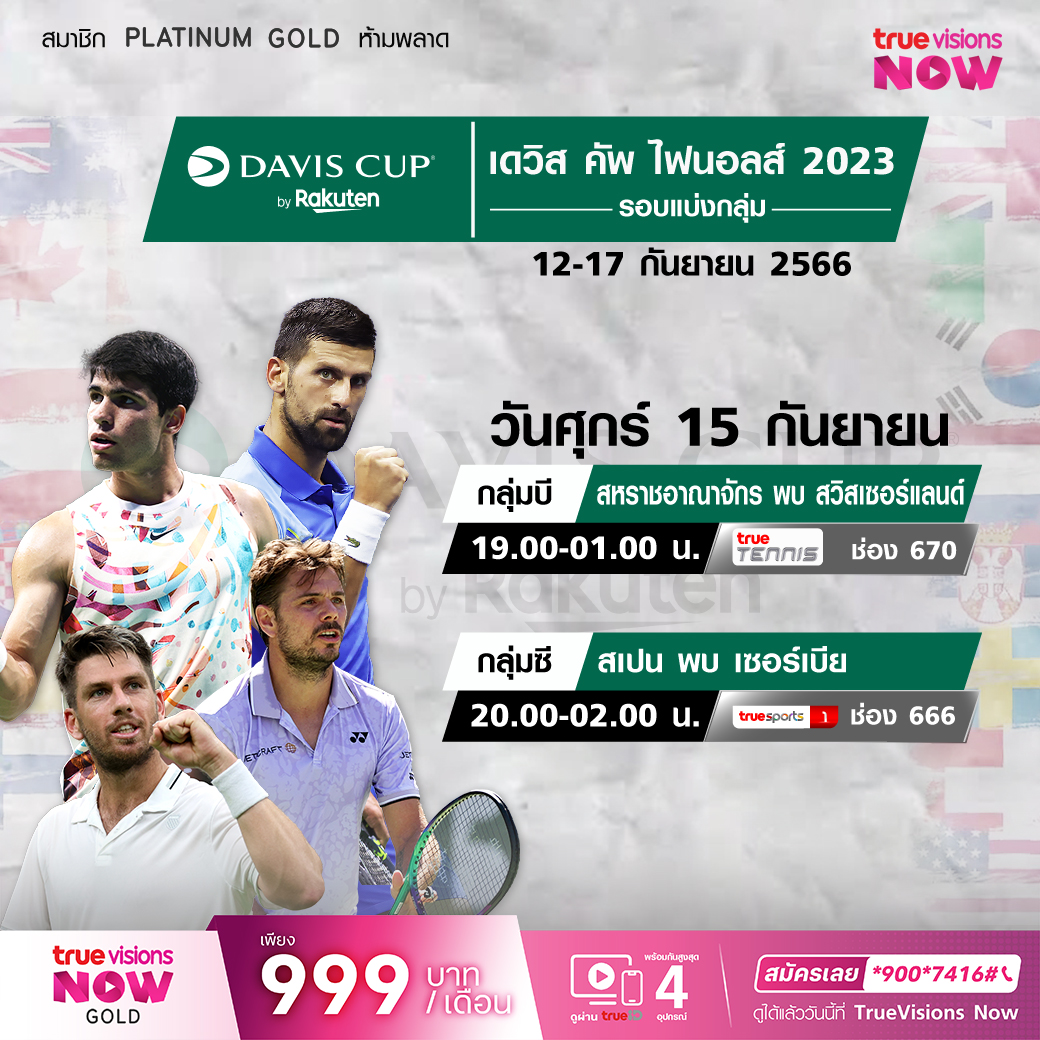 เทนนิสทีมชายชิงแชมป์โลก เดวิส คัพ ไฟนอลส์ 2023 ในรอบ 16 ทีมสุดท้าย ศึกแห่งศักดิ์ศรีและการต่อสู้เพื่อชัยชนะของชาติเป็นเดิมพัน แฟนๆ เตรียมสัมผัสกับบรรยากาศและสีสันของการต่อสู้เพื่อชาติและความภาคภูมิใจ สด เอ็กซ์คลูซีฟ จุใจ ลุ้นกันชาติใดบ้างที่จะผ่านเข้าสู่รอบต่อไปได้ ชมสด ทาง ทรูวิชั่นส์ ที่เดียว