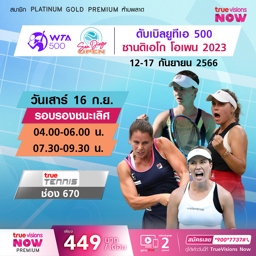 ศึกเทนนิสหญิง ดับเบิ้ลยูทีเอ ทัวร์ รายการระดับ 500 ซีรี่ส์ ซาน ดีเอโก้ โอเพ่น 2023 มือดี มือท็อปของโลก พร้อมจัดเต็มเพื่้อตำแหน่งแชมป์ปีนี้ มันส์แน่นอน สด เอ็กซ์คลูซีฟ ทาง ทรูวิชั่นส์ ที่เดียวรอบรองชนะเลิศ เวลา 04.00 - 06.00 / 07.30 - 09.30 ทางช่อง True Tennis (670)