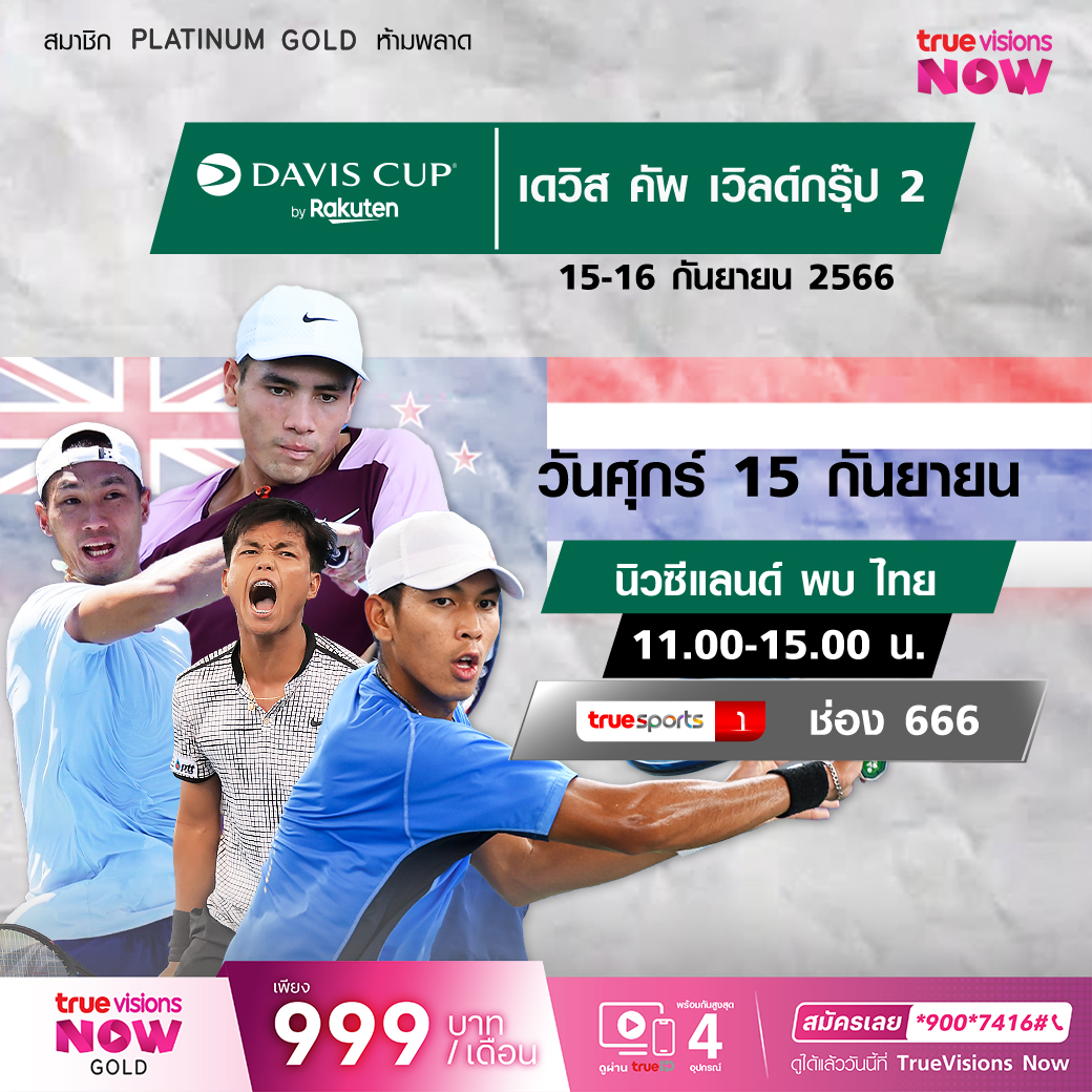 ร่วมเชียรนักเทนนิสทีมชายไทยลงสนามทำศึกในรายการสุดยิ่งใหญ่ เดวิส คัพ เวิลด์ กรุ๊ป 2 ในการบุกเยือน นิวซีแลนด์ สู้ทุกแมตช์ สู้ทุกคะแแนน เพื่อชัยชนะที่เป็นความภาคภูมิใจในการเป็นตัวแทนของชาติ สด เอ็กซ์คลูซีฟ ครบทุกแมตช์ ทาง ทรูวิชั่นส์ ที่เดียว