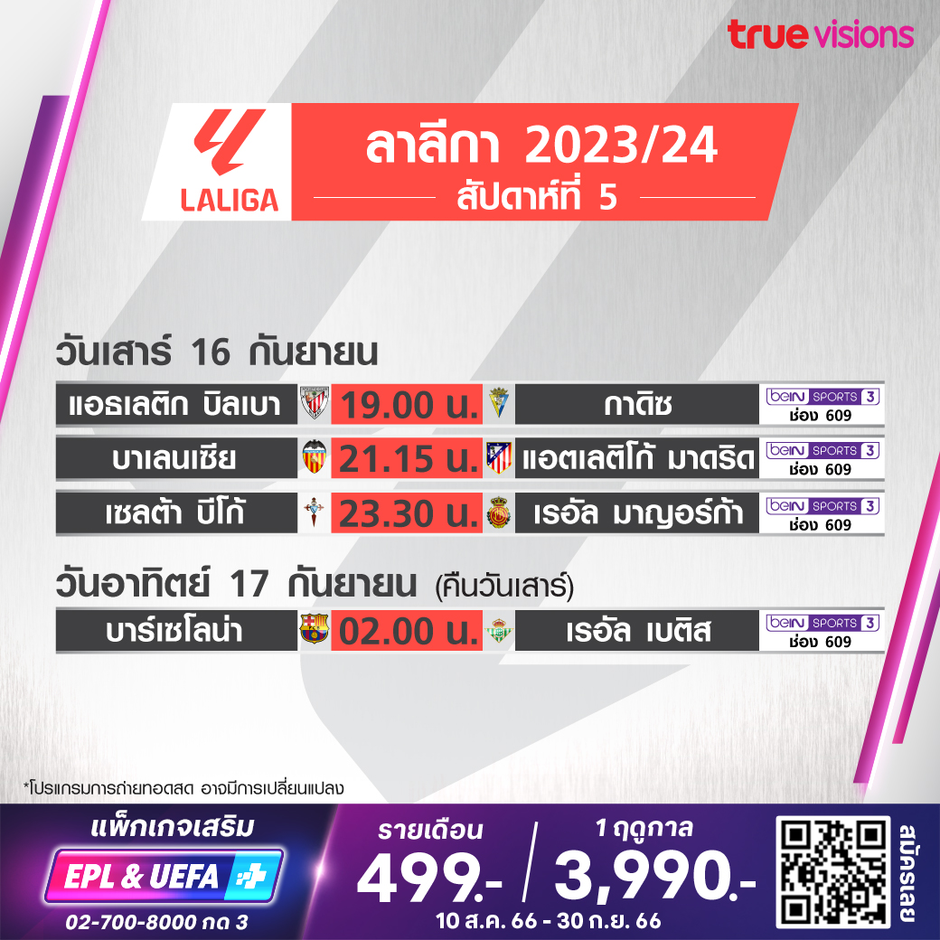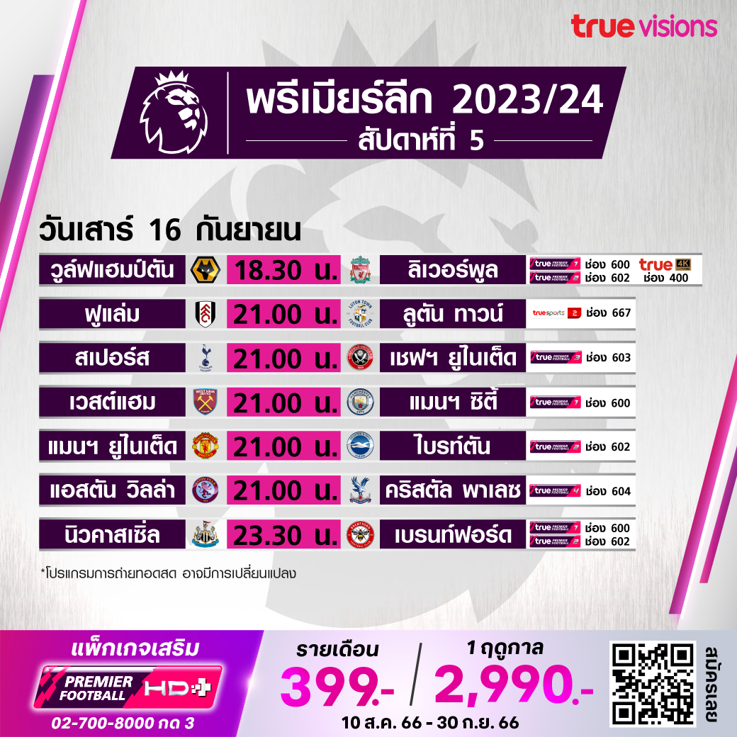 วันนี้มีอะไรดูที่ ทรูวิชั่นส์ ประจำวันเสาร์ที่ 16 กันยายน 66 ในส่วนของฟุตบอลยังมีศึกพรีเมียร์ลีก อังกฤษ, กัลโช่ เซเรีย อา อิตาลี, บุนเดสลีกา เยอรมนี, ลา ลีกา สเปน, ลีก เอิง ฝรั่งเศส และ ซาอุดิ โปร ลีก ให้ได้ตามลุ้นตามเชียร์กันต่อ ส่วนกีฬาอื่นๆ ไฮไลท์อยู่ที่ศึกฟอร์มูล่า วัน รายการ สิงคโปร์ กรังด์ปรีซ์ นอกจากนี้ยังมีเทนนิสรายการสำคัญอย่าง เดวิส คัพ ไฟนอลส์ 2023 และรอบเวิลด์ กรุ๊ป 2, ดับเบิ้ลยูทีเอ ทัวร์ รายการ ซาน ดีเอโก้ โอเพ่น, กอล์ฟพีจีเอ ทัวร์ รายการ ฟอร์ทิเน็ต แชมเปี้ยนชิพ, เลดี้ส์ ยูโรเปี้ยน ทัวร์ รายการ สวิส เลดี้ส์ โอเพ่น, แบดมินตัน บีดับเบิ้ลยูเอฟ รายการ ฮ่องกง โอเพ่น, ศึก เวิลด์ สนุกเกอร์ ทัวร์ รายการ เซี่ยงไฮ้ มาสเตอร์ส, ยูเอฟซี ไฟต์ ไนท์ และศึกกรีฑาระดับโลก ไดมอนด์ ลีก งานนี้ ทรูวิชั่นส์ จัดเต็มให้ชมกันถึงบ้าน