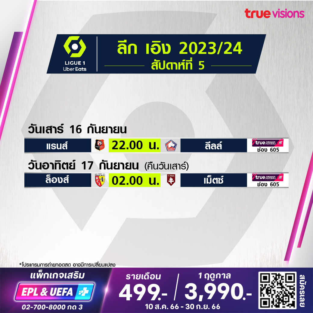 Rennes vs Lille เวลา 22.00-00.00 ทางช่อง TPF 5 (605)