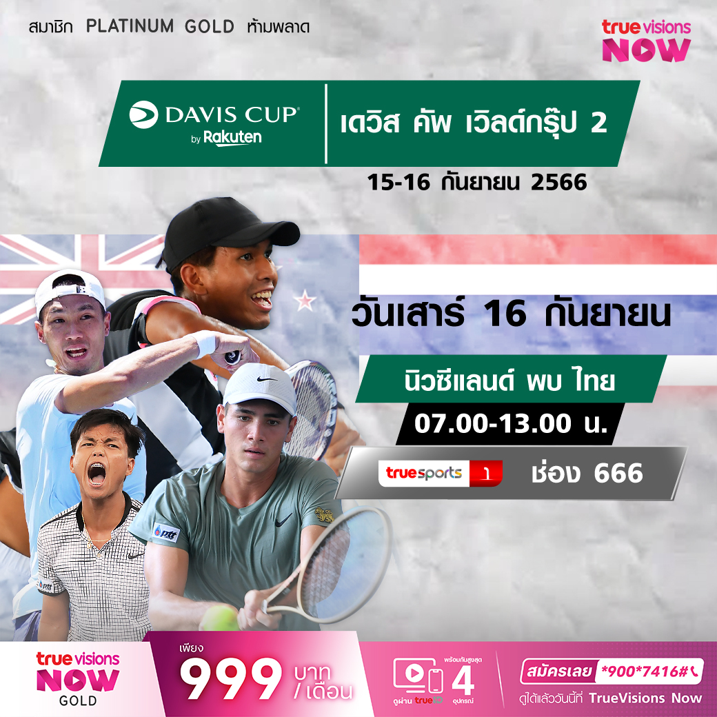 ร่วมเชียร์นักเทนนิสทีมชายไทยลงสนามทำศึกในรายการสุดยิ่งใหญ่ เดวิส คัพ เวิลด์ กรุ๊ป 2 ในการบุกเยือน นิวซีแลนด์ สู้ทุกแมตช์ สู้ทุกคะแแนน เพื่อชัยชนะที่เป็นความภาคภูมิใจในการเป็นตัวแทนของชาติ สด เอ็กซ์คลูซีฟ ครบทุกแมตช์ ทาง ทรูวิชั่นส์ ที่เดียว