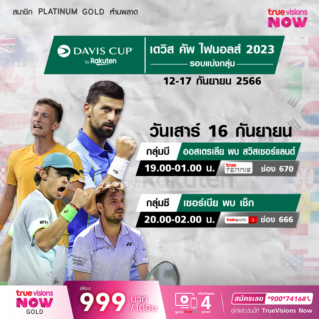 เทนนิสทีมชายชิงแชมป์โลก เดวิส คัพ ไฟนอลส์ 2023 ในรอบ 16 ทีมสุดท้าย ศึกแห่งศักดิ์ศรีและการต่อสู้เพื่อชัยชนะของชาติเป็นเดิมพัน แฟนๆ เตรียมสัมผัสกับบรรยากาศและสีสันของการต่อสู้เพื่อชาติและความภาคภูมิใจ สด เอ็กซ์คลูซีฟ จุใจ ลุ้นกันชาติใดบ้างที่จะผ่านเข้าสู่รอบต่อไปได้ ชมสด ทาง ทรูวิชั่นส์ ที่เดียว