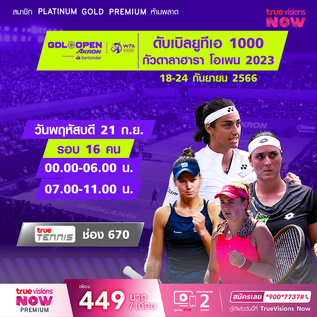 เทนนิสดับเบิลยูทีเอ กัวดาลาฮารา โอเพ่น แอครอน จาก กัวดาลาฮารา ประเทศเม็กซิโก เชียร์นักเทนนิสหญิงระดับโลกร่วมชิงชัย สด เอ็กซ์คลูซีฟ รอบแรกถึงรอบชิงชนะเลิศ ลุ้นกันว่าใครจะเป็นแชมป์ในปีนี้รอบ 16 คน เวลา 00.00 - 06.00 / 07.00 - 11.00 ทางช่อง True Tennis (670)