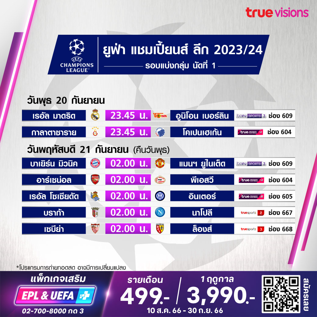 วันนี้มีอะไรดูที่ ทรูวิชั่นส์ ประจำวันพุธที่ 20 กันยายน 66 ในส่วนของฟุตบอลนั้น ไฮไลท์อยู่ที่ศึก ยูฟ่า แชมเปี้ยนส์ ลีก รอบแบ่งกลุ่ม นอกจากนี้ยังมีศึก เอเอฟซี แชมเปี้ยนส์ ลีก ให้ได้ตามลุ้นตามเชียร์กันต่อ ส่วนกีฬาอื่นๆ ยังมีเทนนิสดับเบิ้ลยูทีเอ ทัวร์ รายการ กัวดาลาฮาร่า โอเพ่น งานนี้ ทรูวิชั่นส์ จัดเต็มให้ชมกันถึงบ้าน