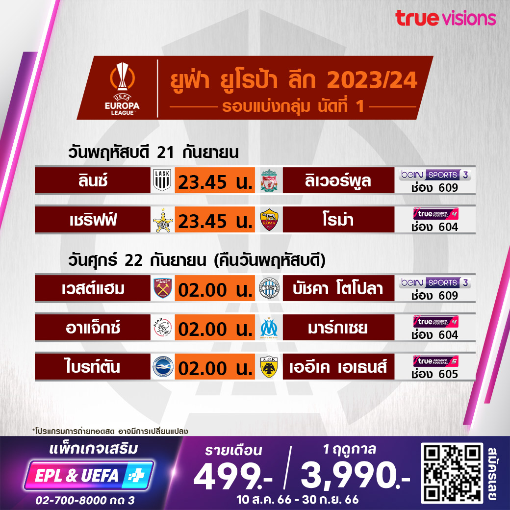 วันนี้มีอะไรดูที่ ทรูวิชั่นส์ ประจำวันพฤหัสบดีที่ 21 กันยายน 66 ในส่วนของฟุตบอลนั้นยังมีศึก ยูฟ่า ยูโรป้า ลีก และ ยูฟ่า ยูโรป้า คอนเฟอเรนซ์ ลีก รอบแบ่งกลุ่ม และ ซาอุดิ โปร ลีก ให้ได้ตามลุ้นตามเชียร์กันต่อ ส่วนกีฬาอื่นๆ ยังมีเทนนิสดับเบิ้ลยูทีเอ ทัวร์ รายการ กัวดาลาฮาร่า โอเพ่น, กอล์ฟหญิงประเภททีมรายการใหญ่ โซลไฮม์ คัพ 2023 และศึกอเมริกันฟุตบอล เอ็นเอฟแอล งานนี้ ทรูวิชั่นส์ จัดเต็มให้ชมกันถึงบ้าน