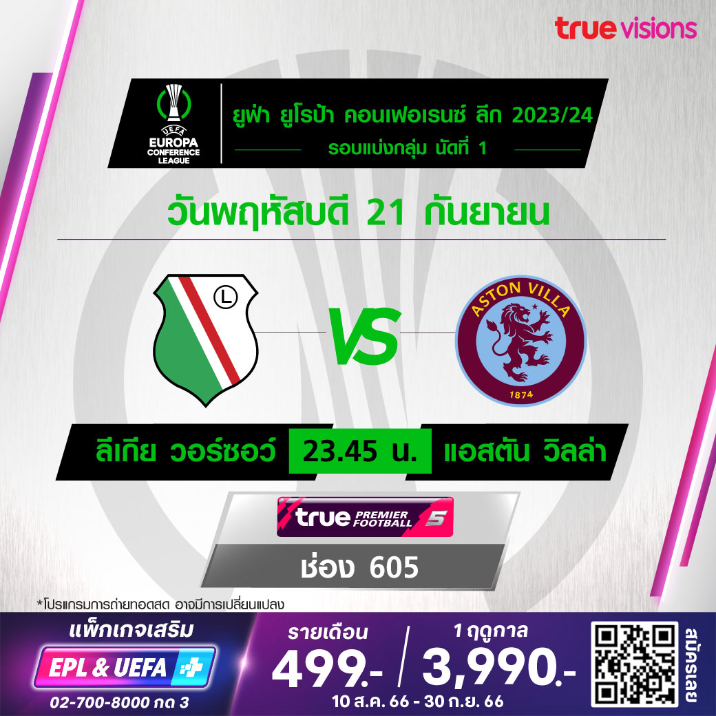 Legia vs Aston Villa เวลา 23.45-01.45 ทางช่อง TPF 5 (605)