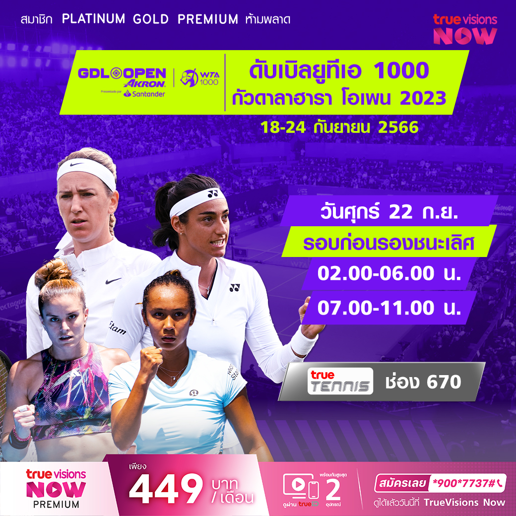 เทนนิสดับเบิลยูทีเอ กัวดาลาฮารา โอเพ่น แอครอน จาก กัวดาลาฮารา ประเทศเม็กซิโก ในรอบก่อนรองชนะเลิศ เชียร์นักเทนนิสหญิงระดับโลกร่วมชิงชัย ลุ้นกันว่าใครจะเป็นแชมป์ในปีนี้ สด เอ็กซ์คลูซีฟ ที่ ทรูวิชั่นส์รอบก่อนรองชนะเลิศ เวลา 02.00 - 06.00 / 07.00 - 11.00 ทางช่อง True Tennis (670)