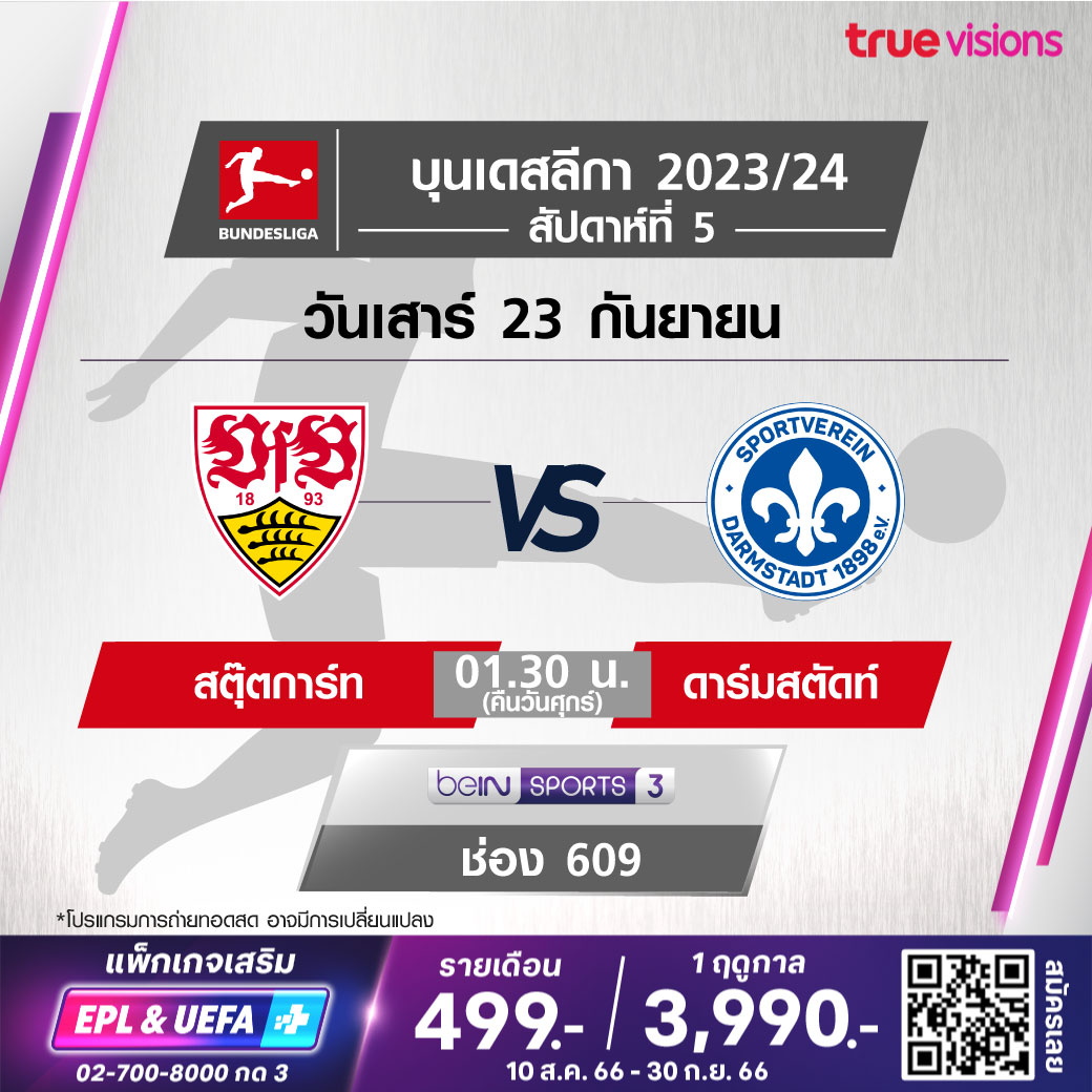 Stuttgart vs Darmstadt เวลา 01.30-03.30 ทางช่อง beIN 3 (609)