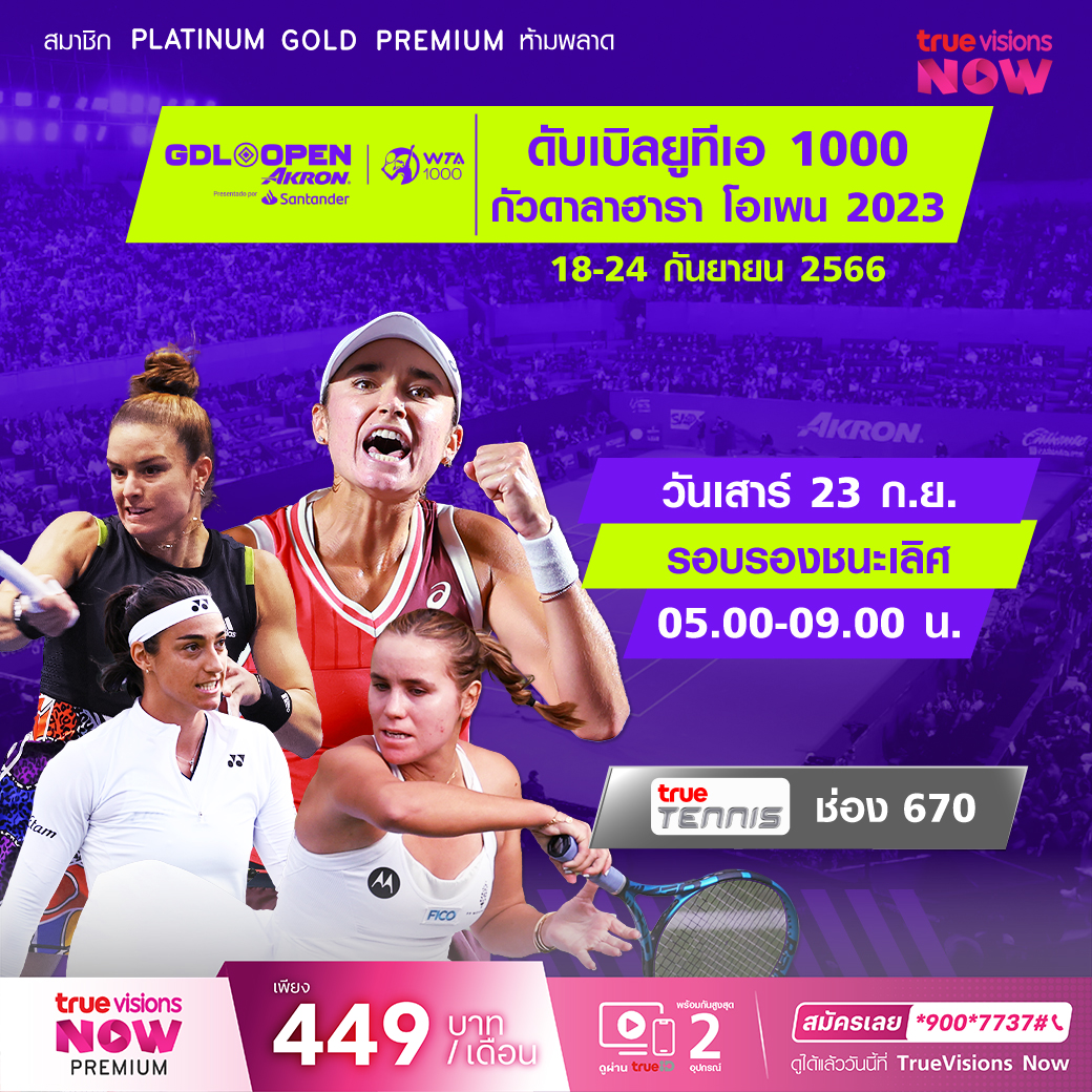 เทนนิสดับเบิลยูทีเอ กัวดาลาฮารา โอเพ่น แอครอน จาก กัวดาลาฮารา ประเทศเม็กซิโก ในรอบรองชนะเลิศ เชียร์นักเทนนิสหญิงระดับโลกร่วมชิงชัย ลุ้นกันว่าใครจะเป็นแชมป์ในปีนี้ สด เอ็กซ์คลูซีฟ ที่ ทรูวิชั่นส์รอบรองชนะเลิศ เวลา 05.00 - 09.00 ทางช่อง True Tennis (670)