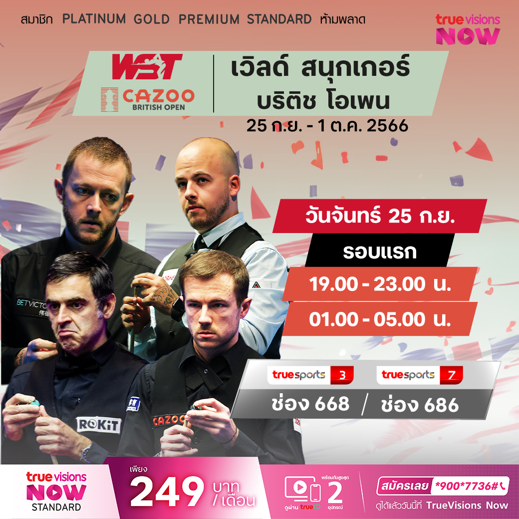 ศึกสอยคิวระดับโลกหวนคืนสู่อังกฤษ ดินแดนต้นกำเนิดสนุกเกอร์ของโลก สัปดาห์นี้แฟนๆ จะได้ชมเหล่าบรรดาตัวเทพของวงการตบเท้ามากันแบบครบ เพื่อคว้าชัยชนะ และลุ้นเป็นแชมป์รายการเก็บคะแนนสะสมโลก บริติช โอเพ่น 2023 จากสังเวียน เซนทัวร์ อารีน่า เฟรมต่อเฟรม รอบต่อรอบ ใครจะได้ชูโทรฟี่เมื่อจบรอบชิงชนะเลิศ สด เอ็กซ์คลูซีฟ ที่ ทรูวิชั่นส์