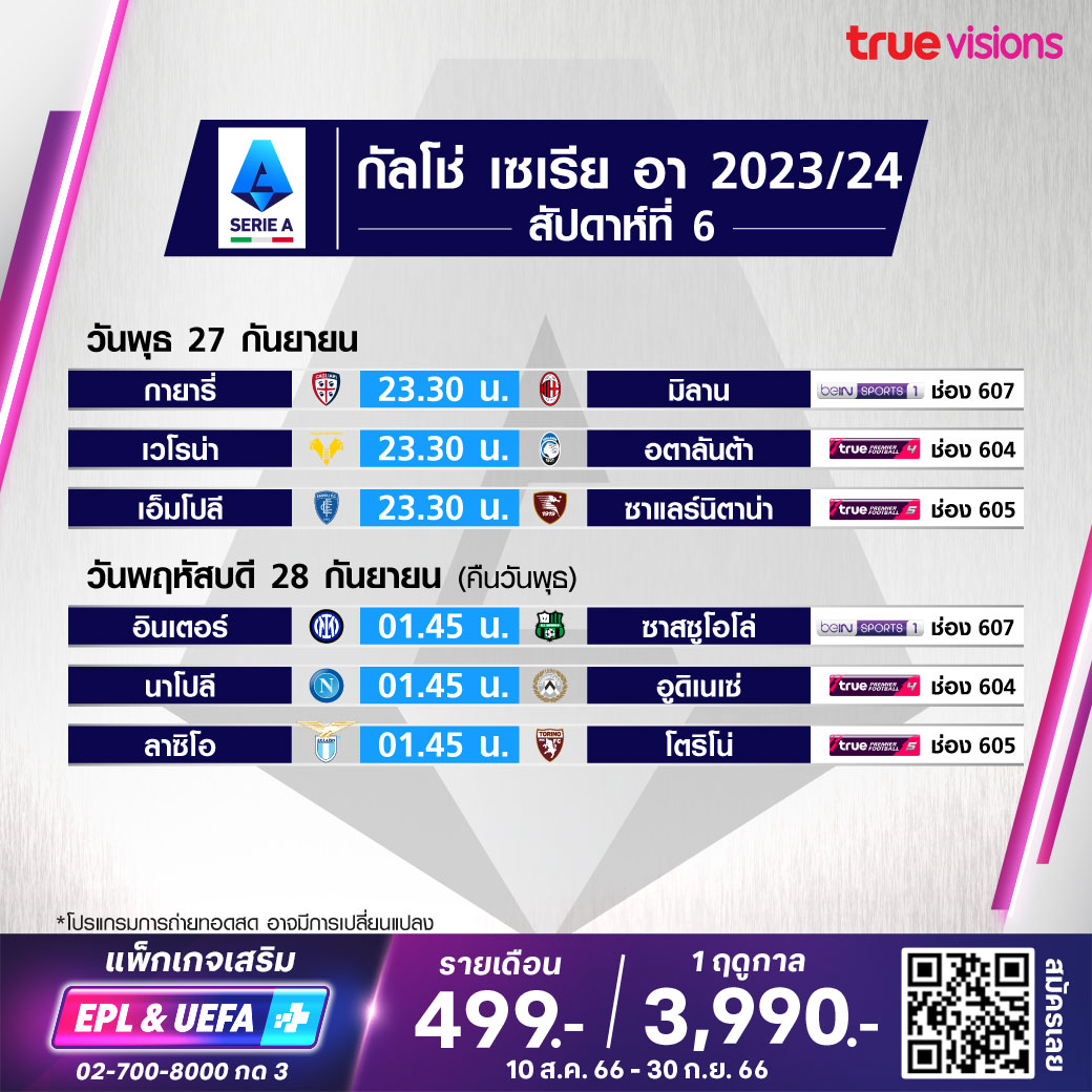 วันนี้มีอะไรดูที่ ทรูวิชั่นส์ ประจำวันพุธที่ 27 กันยายน 66 ในส่วนของฟุตบอลยังมีศึกกัลโช่ เซเรีย อา อิตาลี และ ลา ลีกา สเปน ให้ได้ตามเชียร์กันต่อ ส่วนกีฬาอื่นๆ ยังมีศึกเทนนิส ดับเบิ้ลยูทีเอ ทัวร์ รายการ แพน แปซิฟิก โอเพ่น และ เวิลด์ สนุกเกอร์ รายการใหญ่อย่าง บริติช โอเพ่น งานนี้ ทรูวิชั่นส์ จัดเต็มให้ชมกันถึงบ้าน