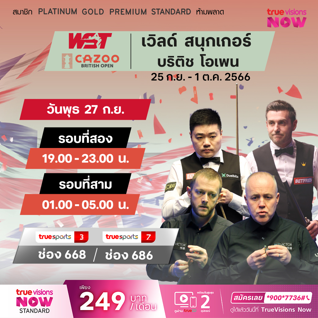 ศึกสอยคิวระดับโลกหวนคืนสู่อังกฤษ ดินแดนต้นกำเนิดสนุกเกอร์ของโลก สัปดาห์นี้แฟนๆ จะได้ชมเหล่าบรรดาตัวเทพของวงการตบเท้ามากันแบบครบ เพื่อคว้าชัยชนะ และลุ้นเป็นแชมป์รายการเก็บคะแนนสะสมโลก บริติช โอเพ่น 2023 จากสังเวียน เซนทัวร์ อารีน่า เฟรมต่อเฟรม รอบต่อรอบ ใครจะได้ชูโทรฟี่เมื่อจบรอบชิงชนะเลิศ สด เอ็กซ์คลูซีฟ ที่ ทรูวิชั่นส์