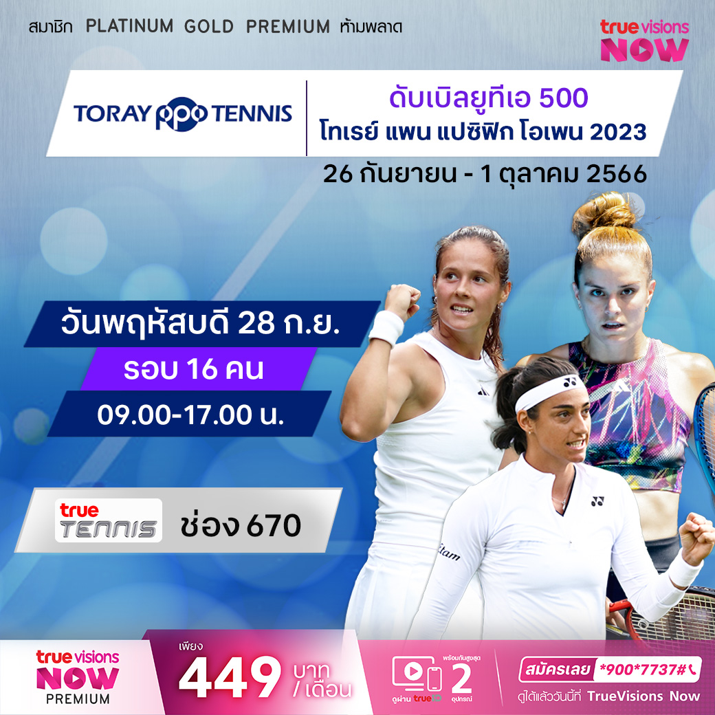 เทนนิส ดับเบิ้ลยูทีเอ ทัวร์ สัปดาห์นี้ติดตามการดวลแร็คเก็ตที่ประเทศญี่ปุ่น กับรายการสุดคลาสสิก โทเรย์ แพน แปซิฟิก โอเพ่น เทนนิส 2023 ในรอบ 16 คนสุดท้าย สด เอ็กซ์คลูซีฟ จากกรุงโตเกียวครบทุกรอบ ทาง ทรูวิชั่นส์ ที่เดียว