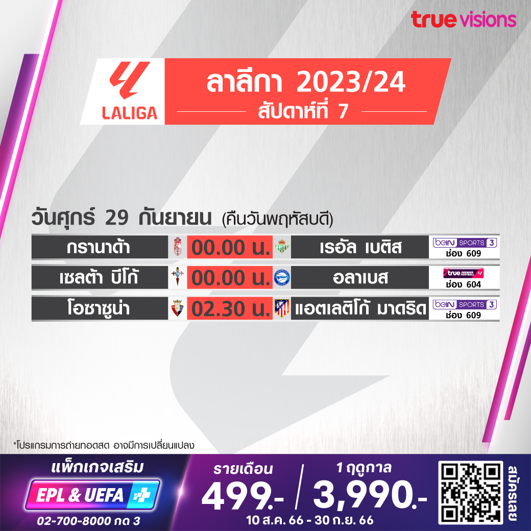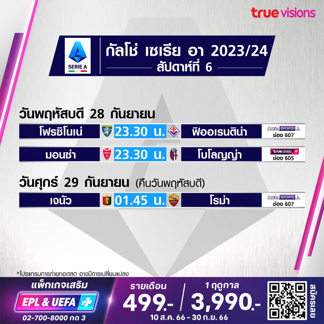 วันนี้มีอะไรดูที่ ทรูวิชั่นส์ ประจำวันพฤหัสบดีที่ 28 กันยายน 66 ในส่วนของฟุตบอลยังมีศึกกัลโช่ เซเรีย อา อิตาลี และ ลา ลีกา สเปน ให้ได้ตามเชียร์กันต่อ ส่วนกีฬาอื่นๆ ยังมีศึกเทนนิส เอทีพี ทัวร์ รายการ ไชน่า โอเพ่น, ดับเบิ้ลยูทีเอ ทัวร์ รายการ แพน แปซิฟิก โอเพ่น, กอล์ฟประเภททีมที่ยิ่งใหญ่ที่สุด ไรเดอร์ คัพ, เวิลด์ สนุกเกอร์ รายการใหญ่อย่าง บริติช โอเพ่น และศึกอเมริกันฟุตบอล เอ็นเอฟแอล งานนี้ ทรูวิชั่นส์ จัดเต็มให้ชมกันถึงบ้าน